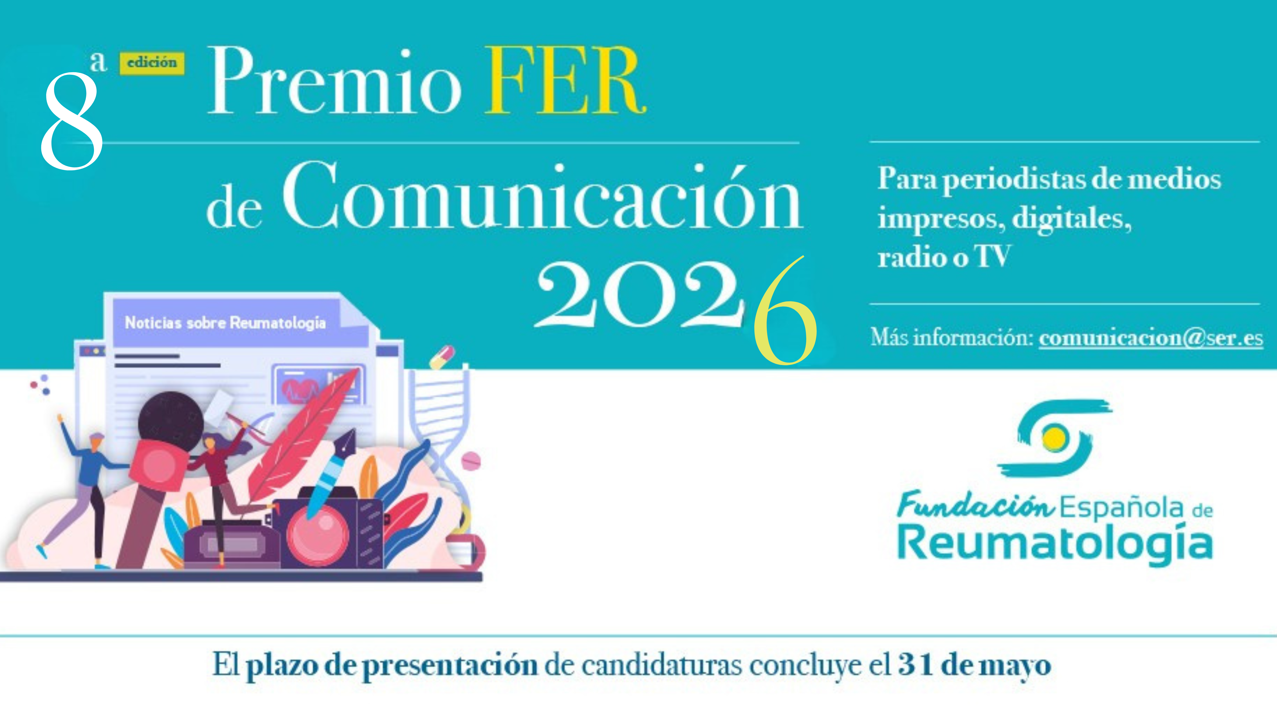 La Sociedad Española de Reumatología, a través de su Fundación, convoca de nuevo el Premio FER de Comunicación 2026, que este año cumple su octava edición. Este galardón está dirigido a periodistas, programas o medios de comunicación que hayan contribuido a dar visibilidad a la Reumatología y/o las enfermedades reumáticas, mediante trabajos periodísticos relacionados con la especialidad que hayan sido publicados entre el 1 de enero de 2025 hasta el 31 de diciembre de 2025. Se valorará especialmente su contenido divulgativo.