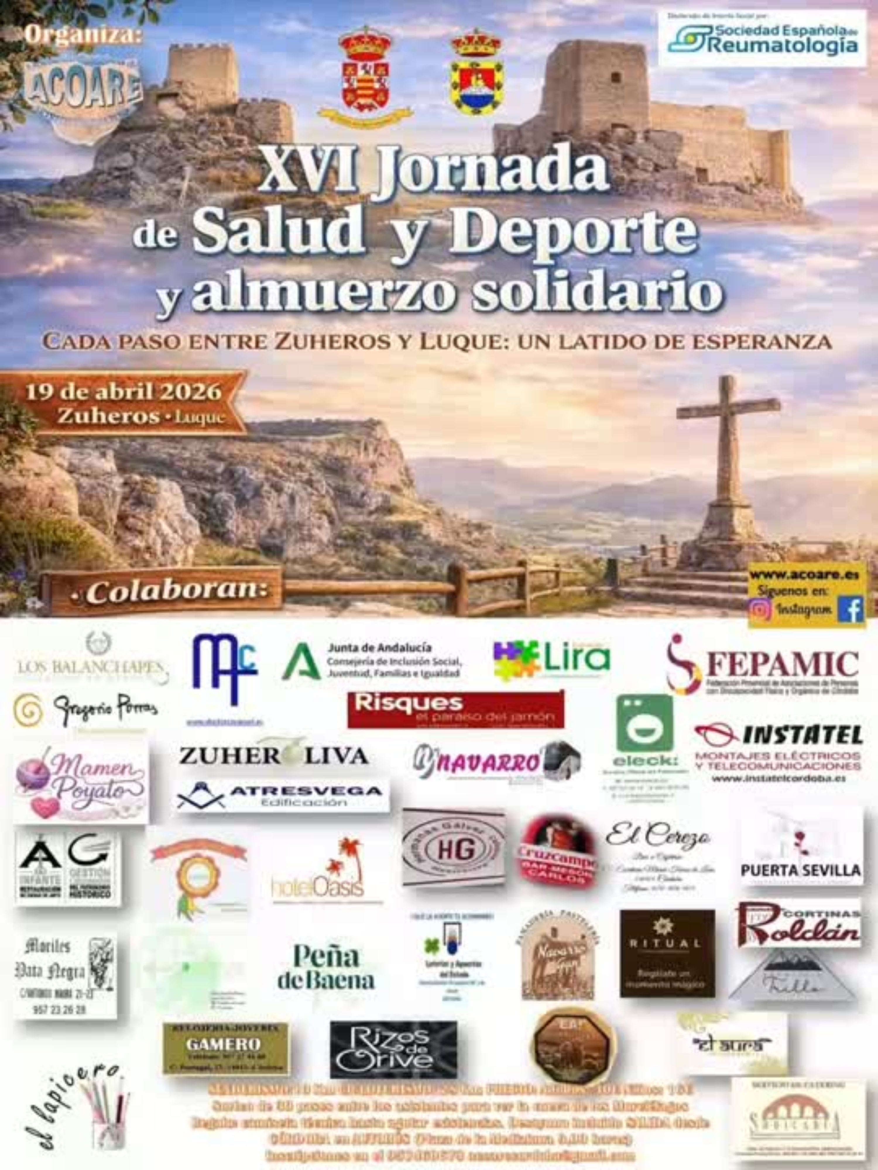El 19 de abril la Asociación Cordobesa de Enfermos de Artritis Reumatoide (ACOARE) organiza su XVI Jornada de Salud y Deporte y almuerzo solidario, en Zuheros.